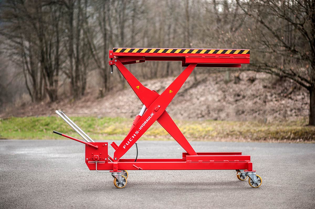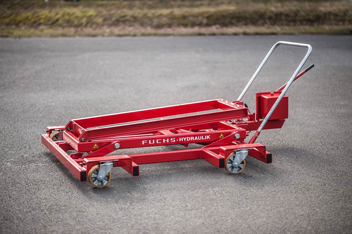 Fuchs Hydraulik manufactures hydraulic lifting trollies for commercial vehicle workshops. Products are available in two categories: Scissor lift and parallelogram lifting trollies. The lifting trollies are designed for the installation, removal and transport of heavy components up to a weight of 2500 kg and feature a stroke of up to 1000 mm. As a German company with headquarters and production in Rhineland-Palatinate, with our lifting trollies we stand for quality “Made in Germany”.