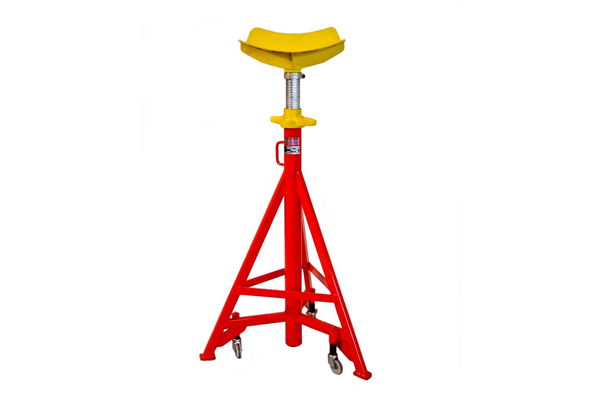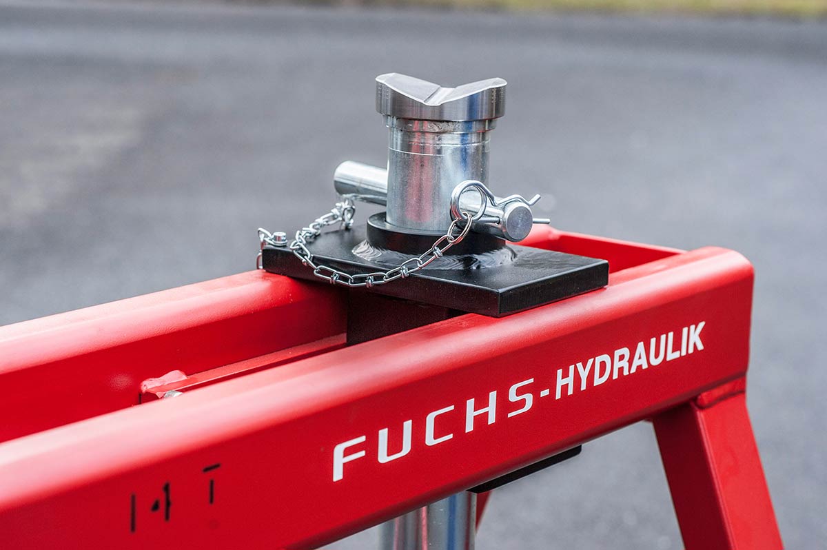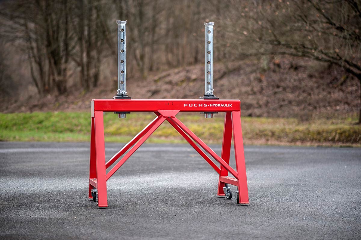 Fuchs Hydraulik strut stands are optionally equipped with continuous adjustment via a trapezoidal thread spindle or with six-point adjustment via locking pins. The robust, tilt-proof steel structure is equipped with four spring-loaded casters for easy positioning.